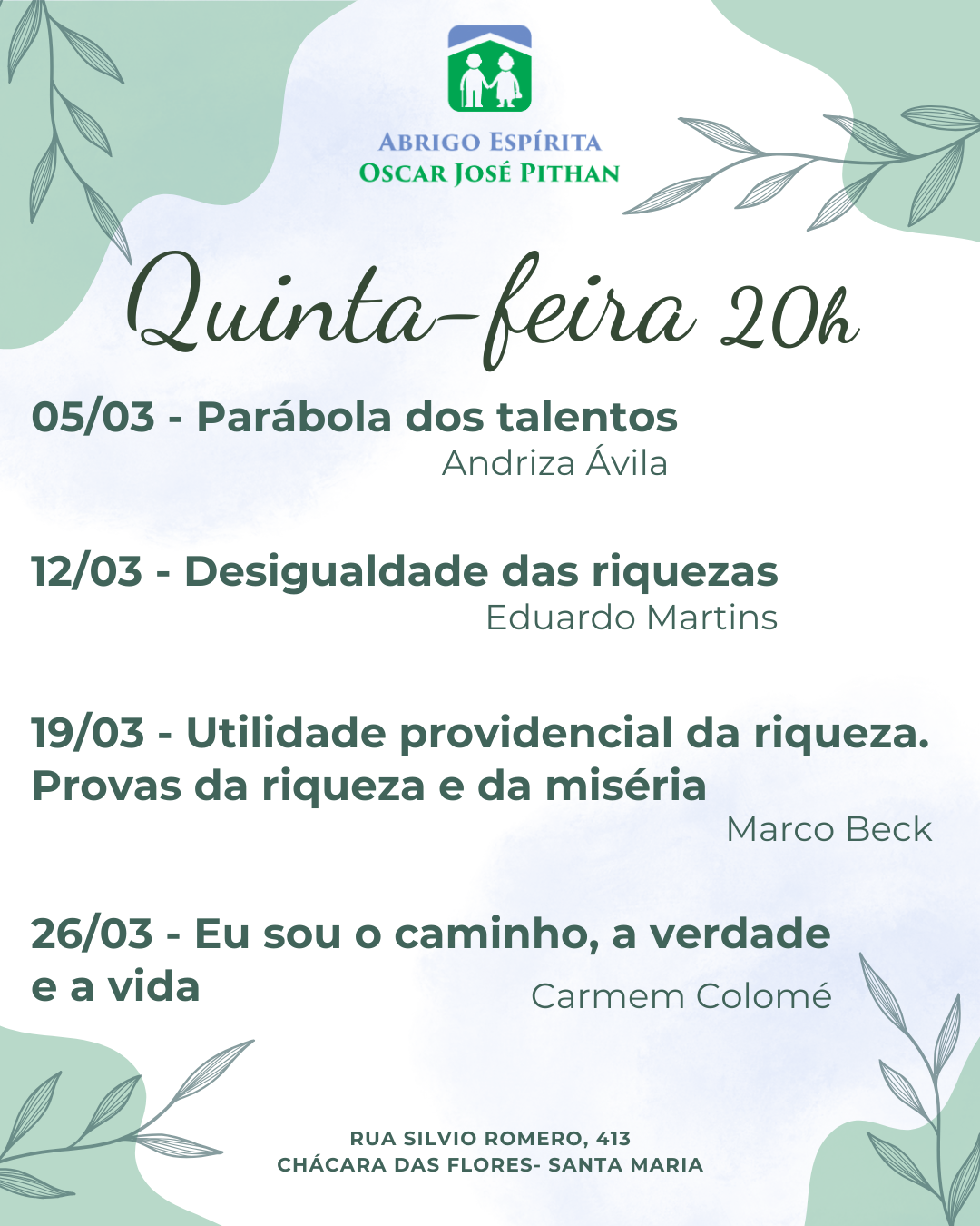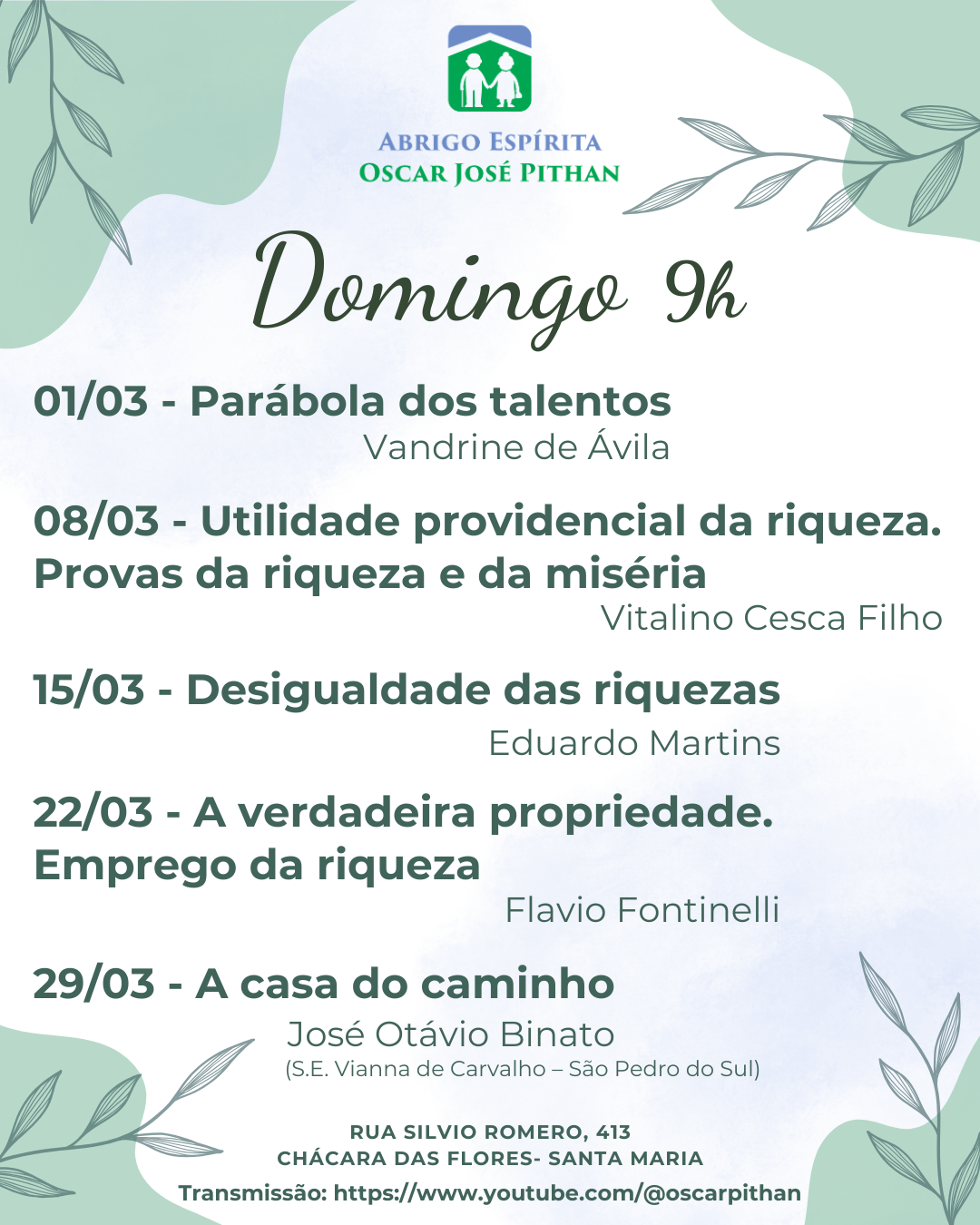 Confira abaixo os temas e expositores das doutrinárias deste mês. (expositor e tema estão sujeitos a alterações)