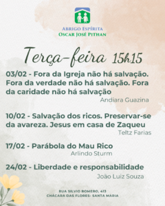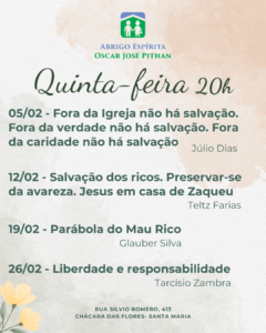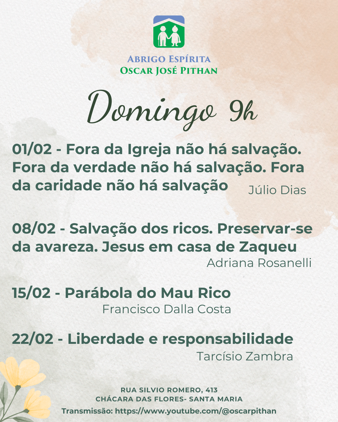Transmissão de exposições doutrinárias: Aos domingos, ao vivo pelo Youtube (https://www.youtube.com/@oscarpithan)